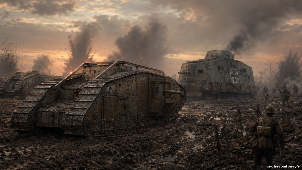 Depuis 1916, les Alliés cherchent un moyen de briser cette impasse. C’est dans ce contexte qu’apparaît le char d’assaut, une machine lourde, lente, bruyante, mais capable de franchir les tranchées et d’écraser les réseaux de barbelés. Le mot anglais “tank”, qui signifie réservoir, aurait été utilisé comme nom de code pour dissimuler la véritable fonction de ces engins durant leur développement.